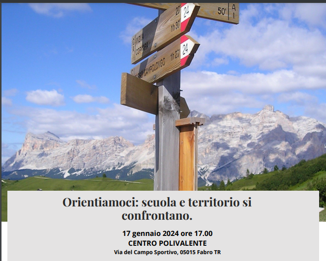 MERCOLEDI’ 17 GENNAIO 2024 SIETE INVITATI A PRENDERE PARTE ALL’INCONTRO CHE SI TERRA’ PRESSO LA SALA POLIVALENTEDI FABRO SCALO PER UNA RIFLESSIONE SULLE OPPORTUNITA’ FORMATIVE E OCCUPAZIONALI DEL NOSTRO TERRITORIO. Per il programma clicca qui